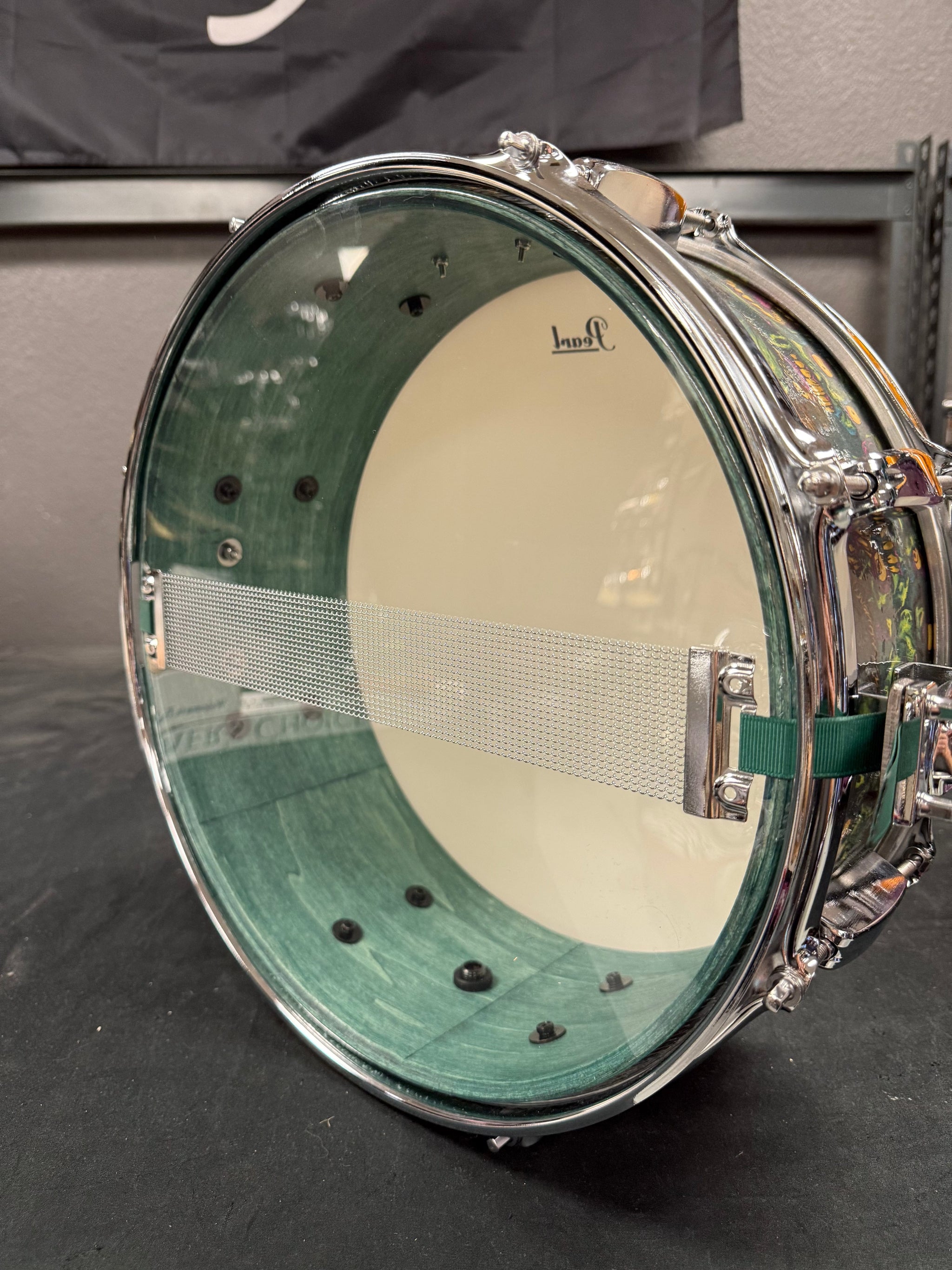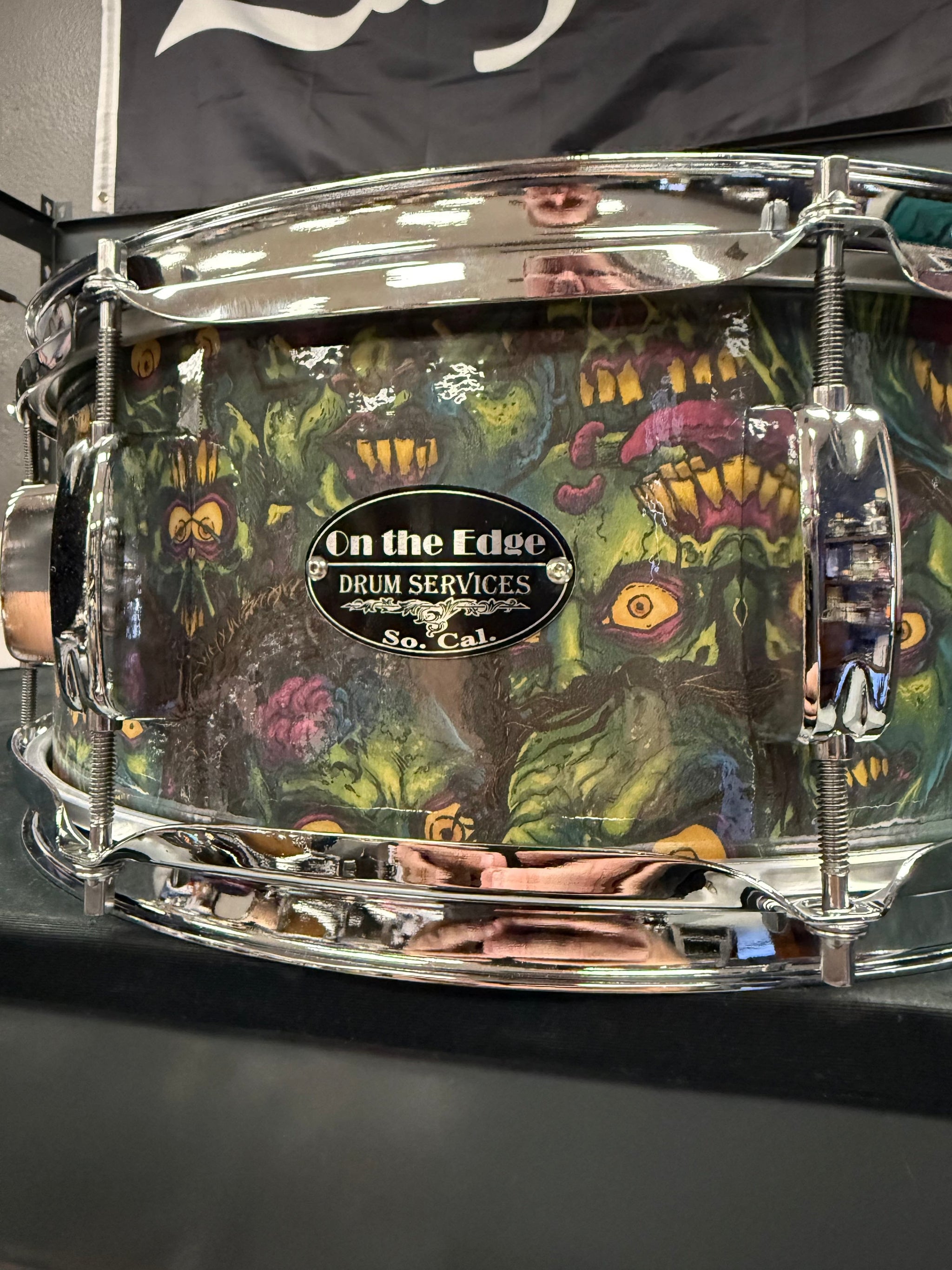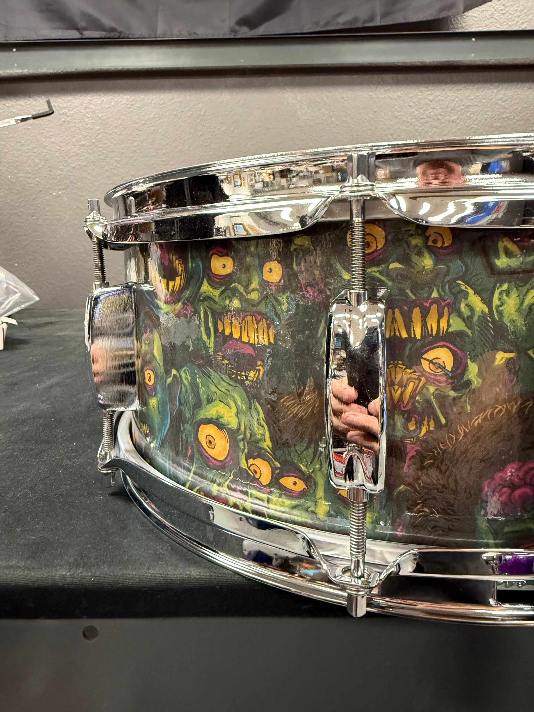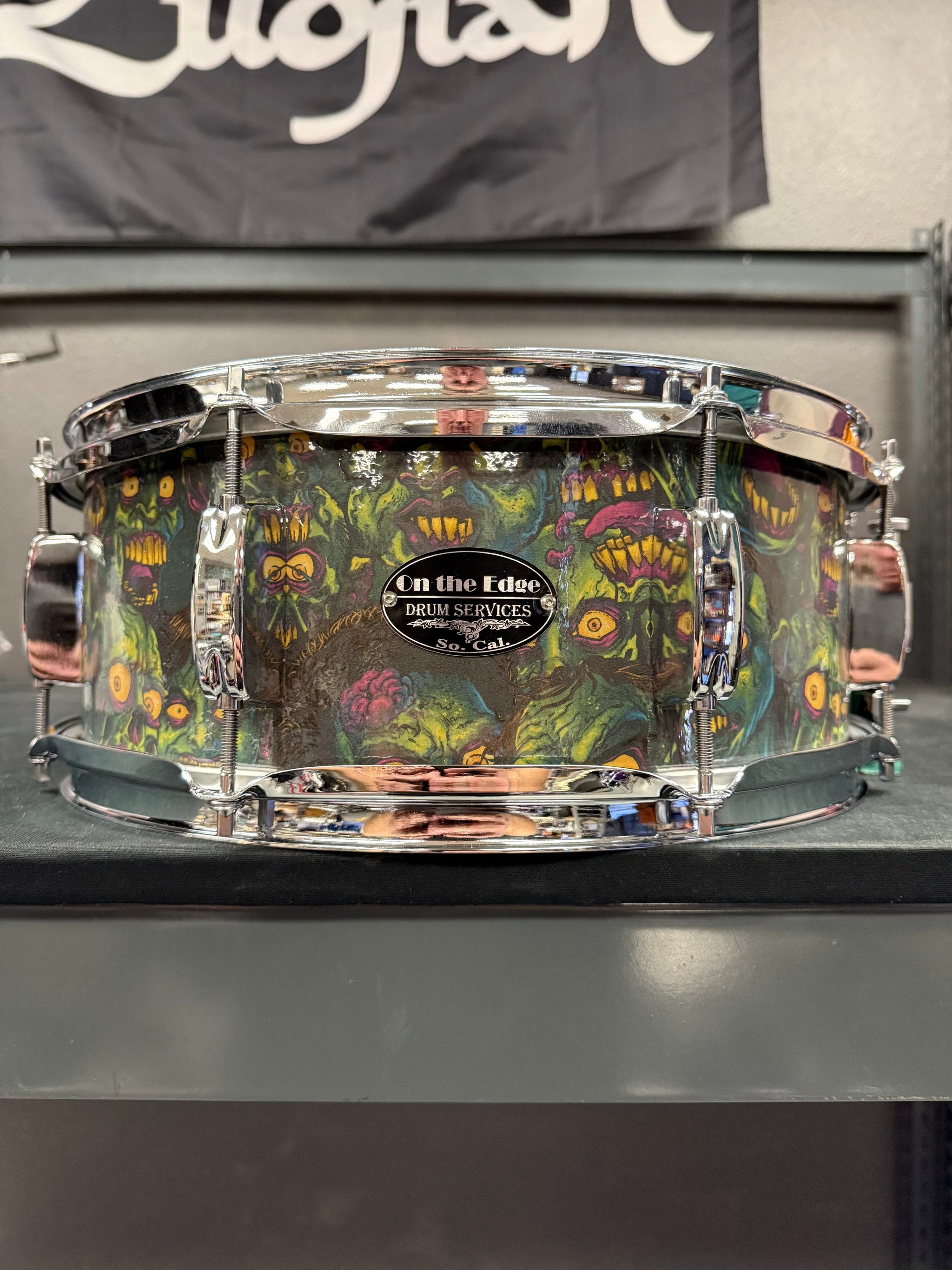 On the Edge Zombie snare drum 14x5.5” poplar shell. Zombie wrap with green stain interior. This was a Pearl Roadshow snare that have been tricked out with new wrap and new interior.