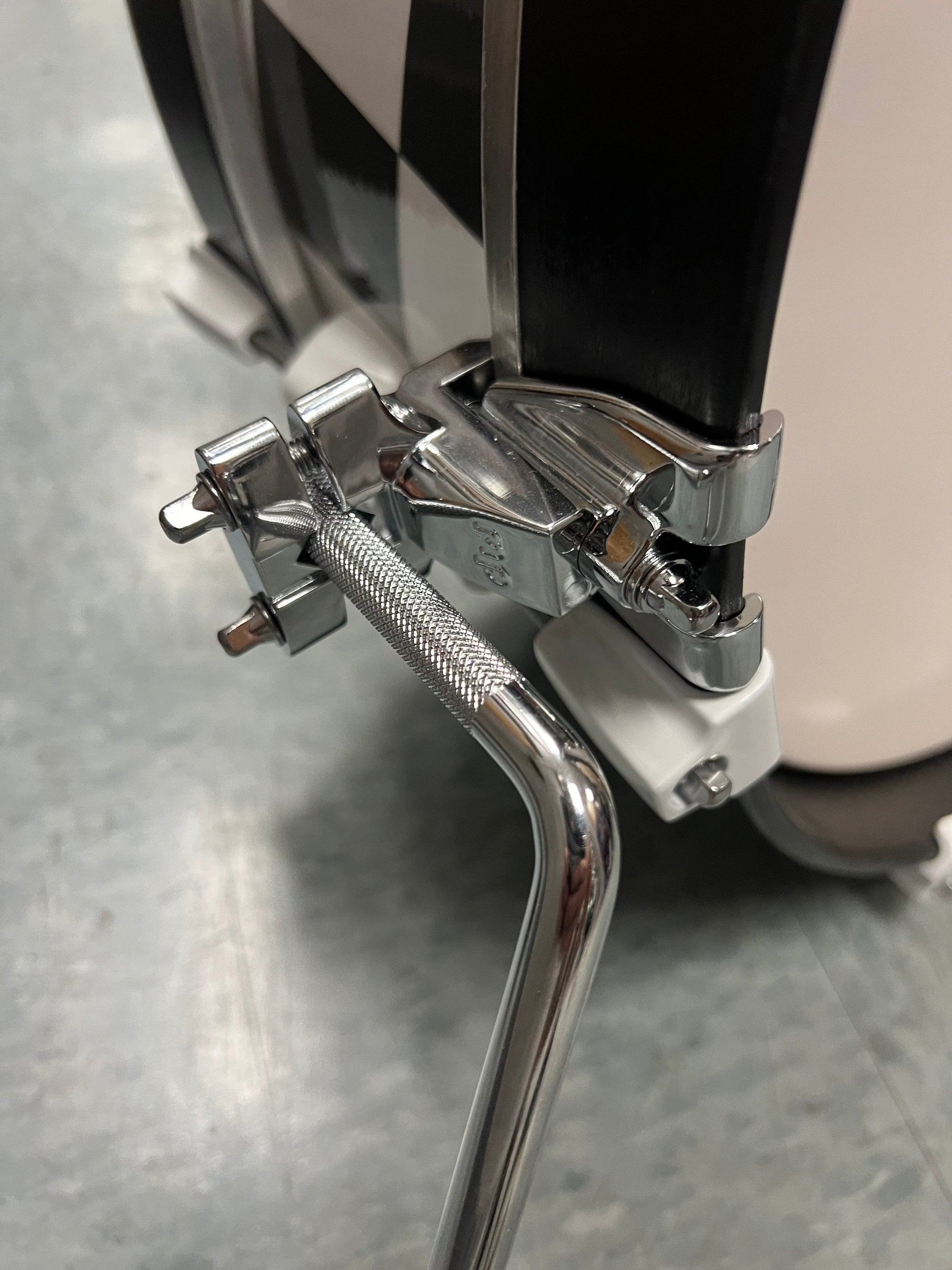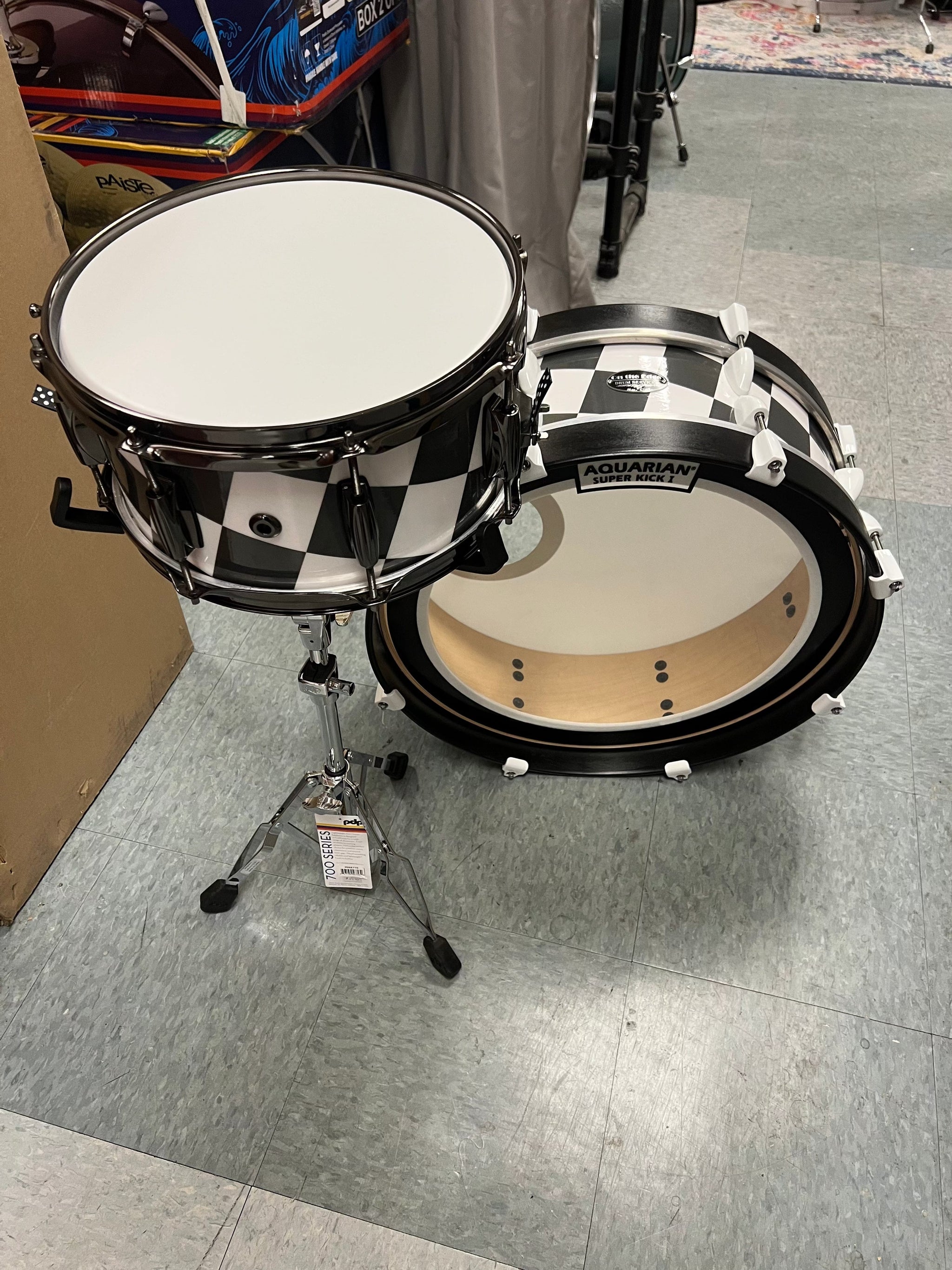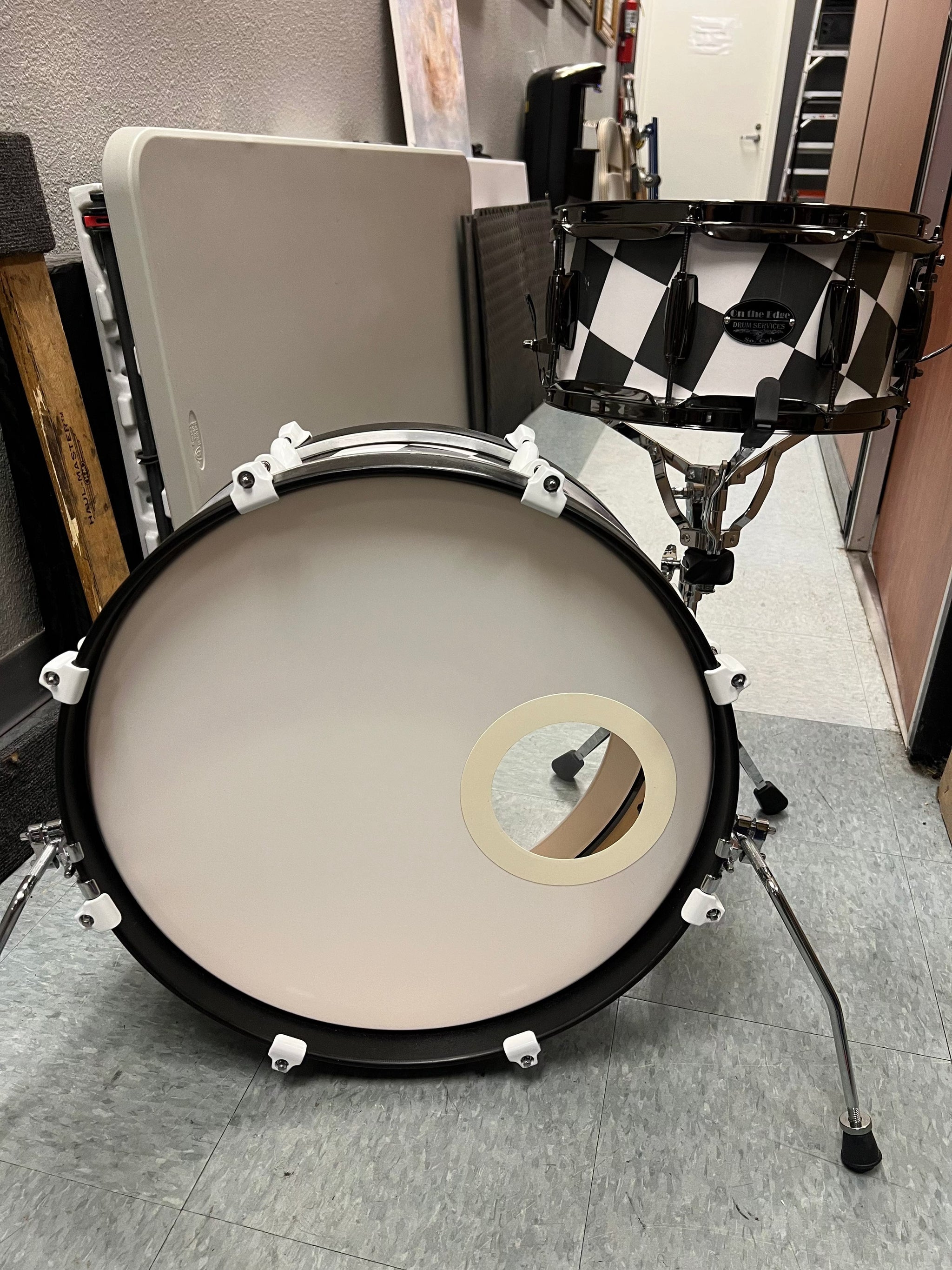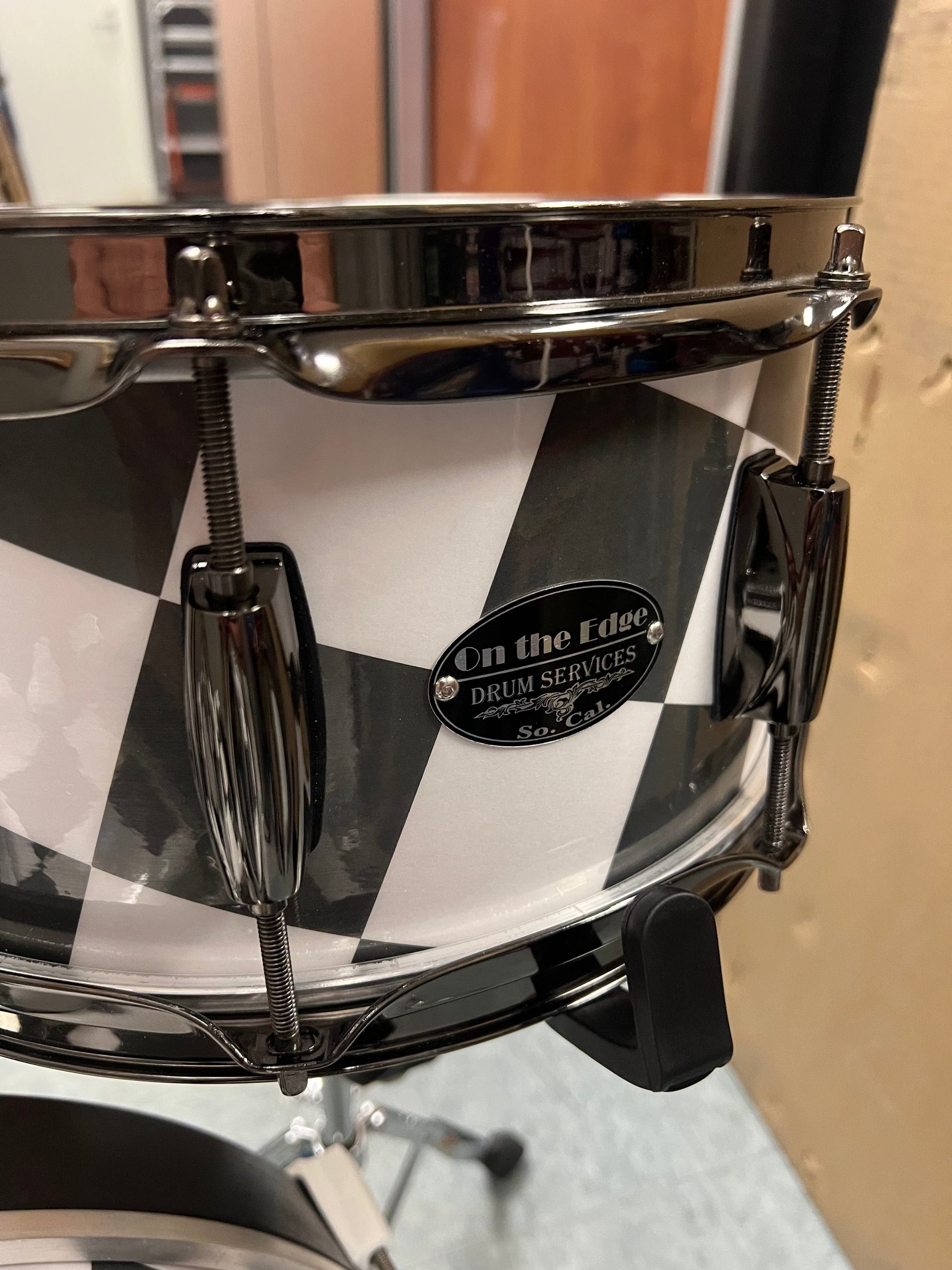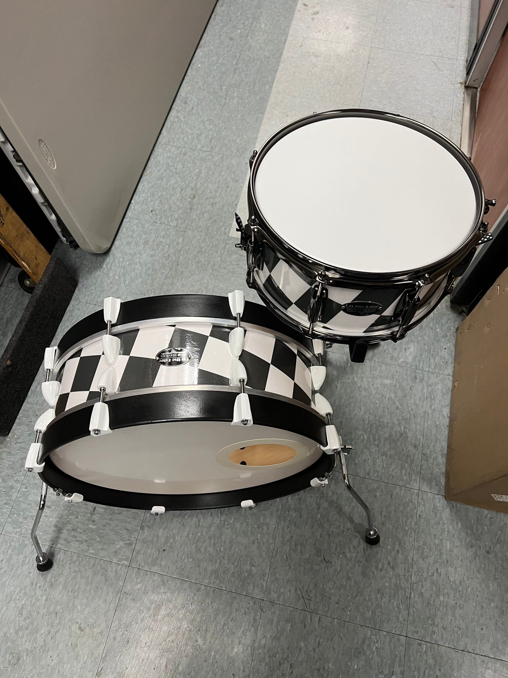 On The Edge 2pc Checkerboard Black and White wrap drum set. DW Bass drum spurs. Snare stand not included.