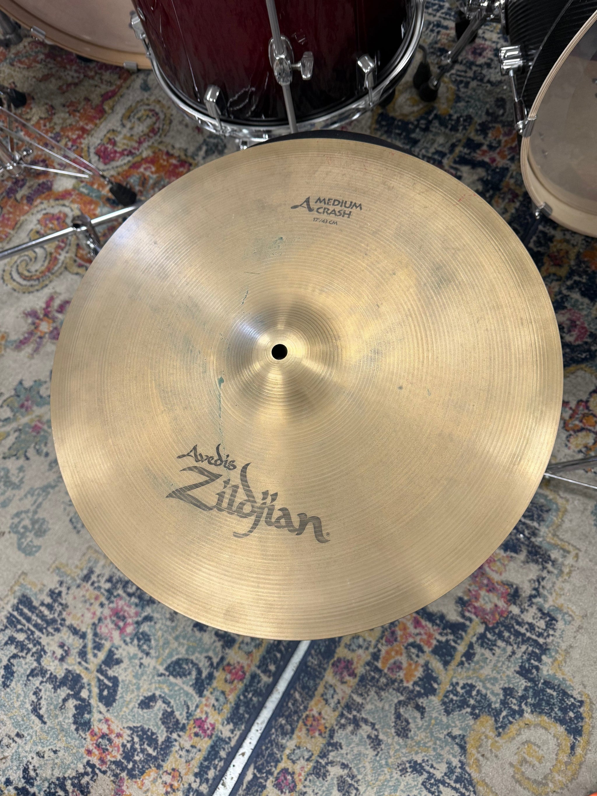 Zildjian 17” A medium crash cymbal used. Warm, full dark crash. Used mild patina.