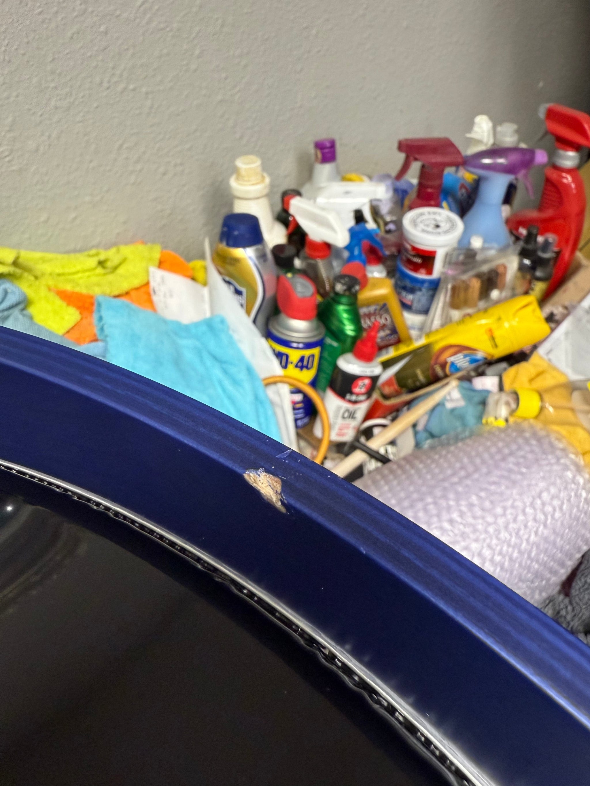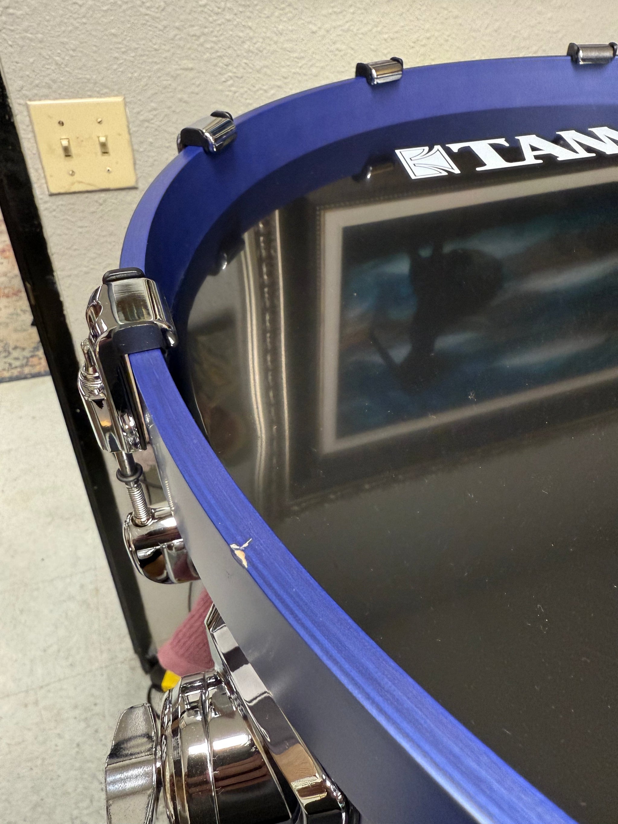 Bass Drum front hoops has 3 wood chip scrapes and indents as shown. Front bass drum head has stick marks