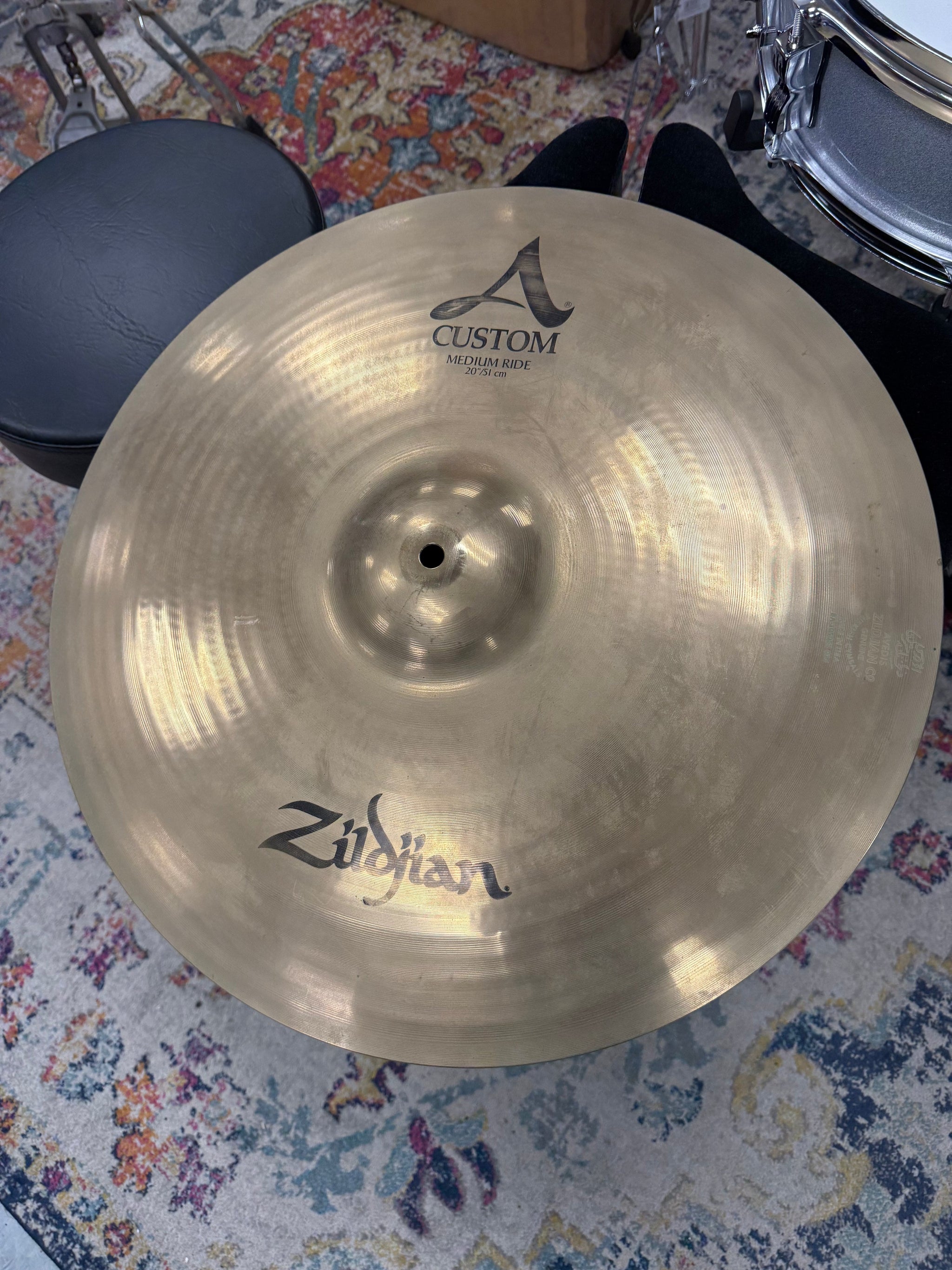 Zildjian A Custom 20” Medium Ride cymbal is applicable for any style of music. Articulate stick sound with a balanced wash. Cutting bell tone. Crashable. Brilliant finish.