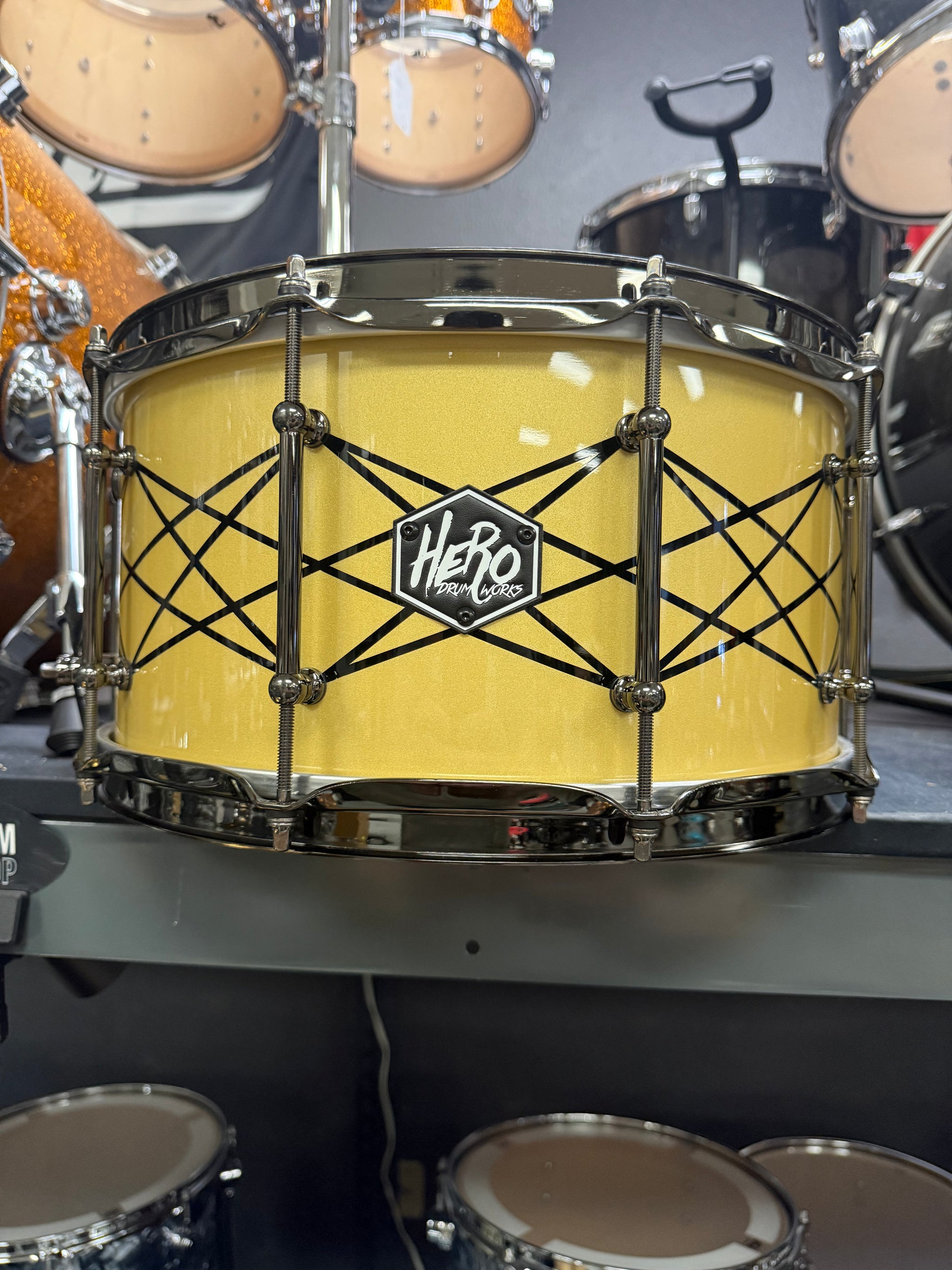 Hero Drum Works 14x7” Cream sparkle spider web design snare drum!