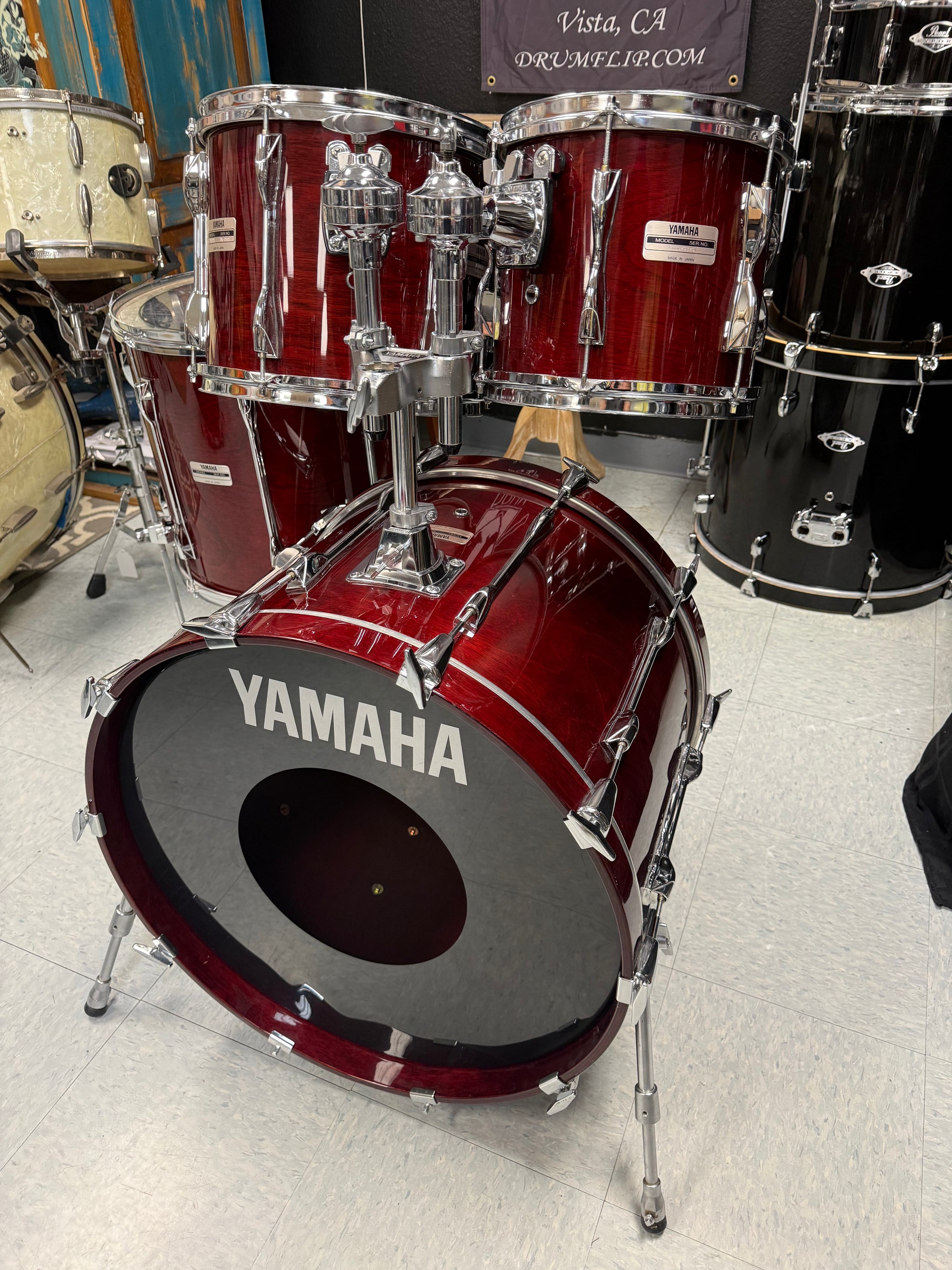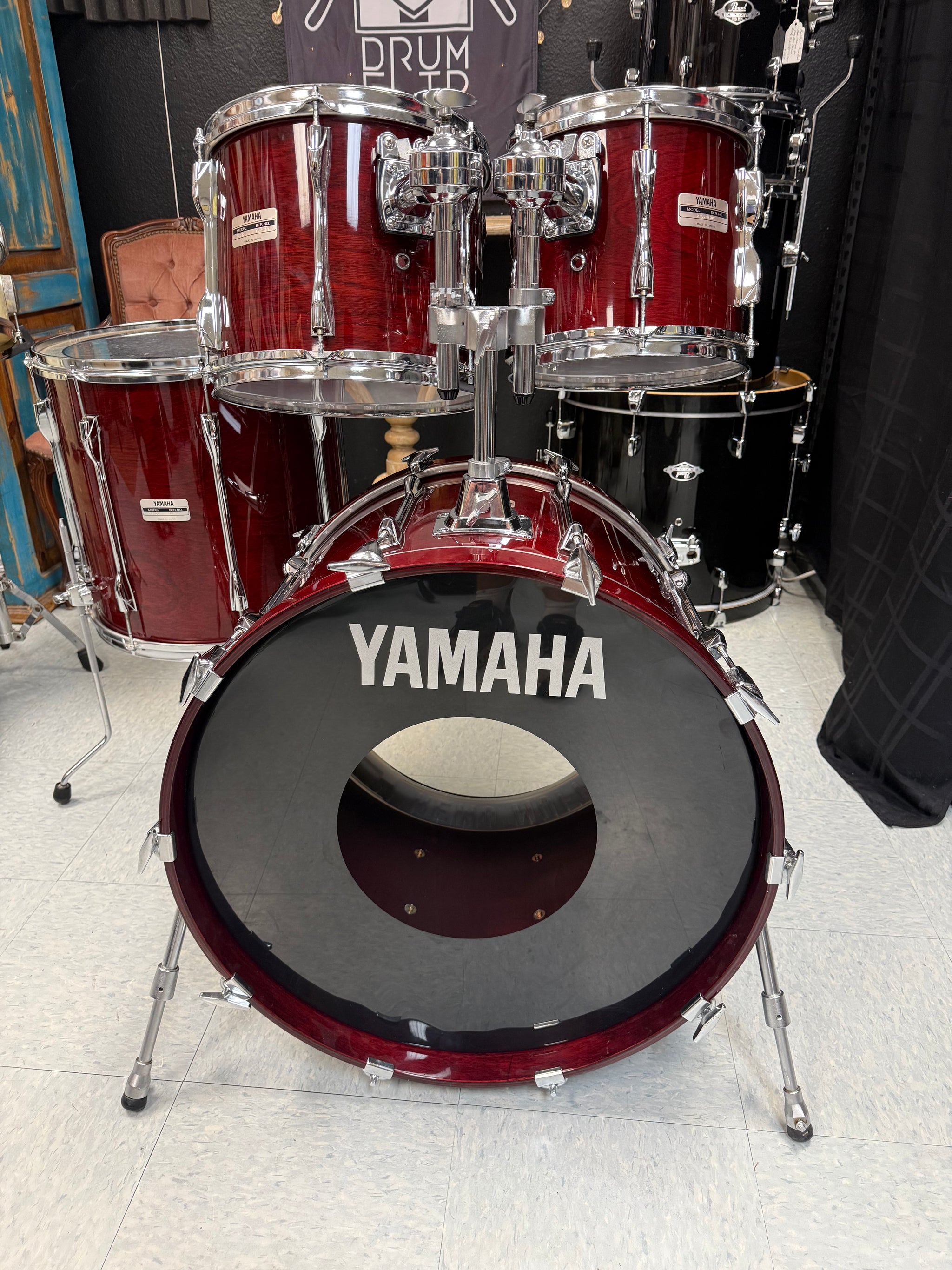 Yamaha Recording Custom Cherry finish drum set. Used very, very nice condition. Made In Japan. Warm, dark, punchy drums that sound incredible.